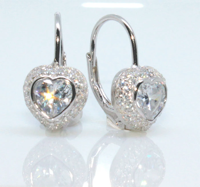 Stříbrné náušnice zdobené zirkony. Ozdobné části náušnic mají tvar srdíčka s velkým kamínkem uprostřed. Povrch náušnic je porodiovaný, nanesené rodium dodává náušnicím jasnou barvu a lesk, současně také zamezuje přirozené oxidaci stříbra. Ozdobné část náušnic tvaru srdce má rozměr 8x8 mm, celkový rozměr náušnice 11x9x8 mm.