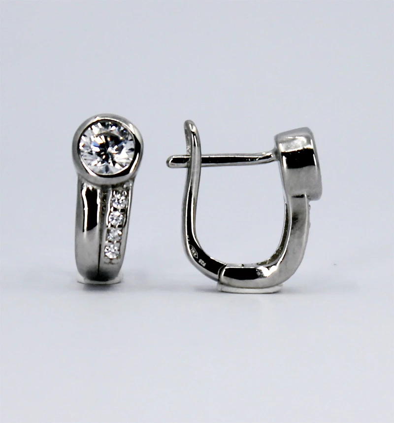 Náušnice stříbrné visací zdobené zirkony. Povrch náušnic je porodiovaný, nanesené rodium dodává náušnicím jasnou barvu a lesk, současně také zamezuje přirozené oxidaci stříbra. Průměr kulatého kamínku 6 mm, celkový rozměr náušnice 13x10 mm. Náušnice se zapínáním na ruský patent.