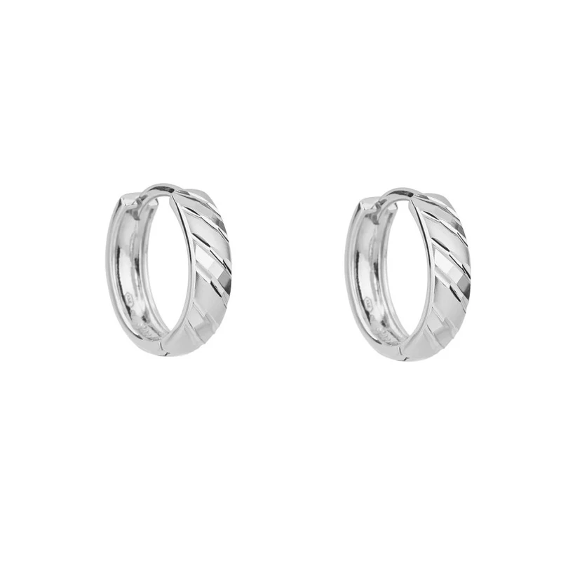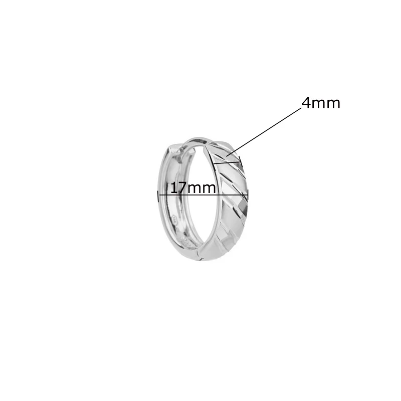 Kruhové náušnice vyrobené z kvalitního stříbra 925/1000. Povrch náušnic je kombinace mat/lesk. Náušnice jsou navíc porhodiované , což jim dodává jasnou barvu s leskem, potlačuje přirozenou oxidaci stříbra, zvyšuje odolnost povrchu proti poškrábání a zaručuje dlouhodobý bezvadný vzhled náušnic. Náušnice jsou široké 4 mm, vnější průměr náušnic 14 mm. Náušnicové zapínání je kloubové.