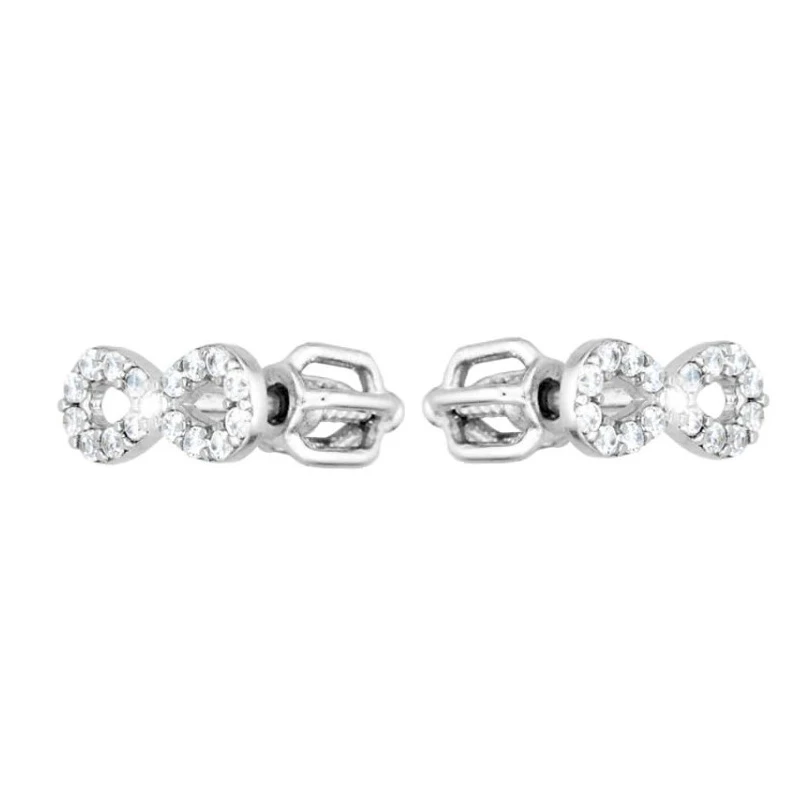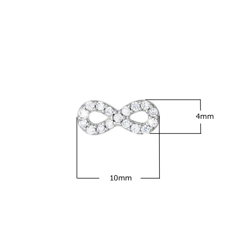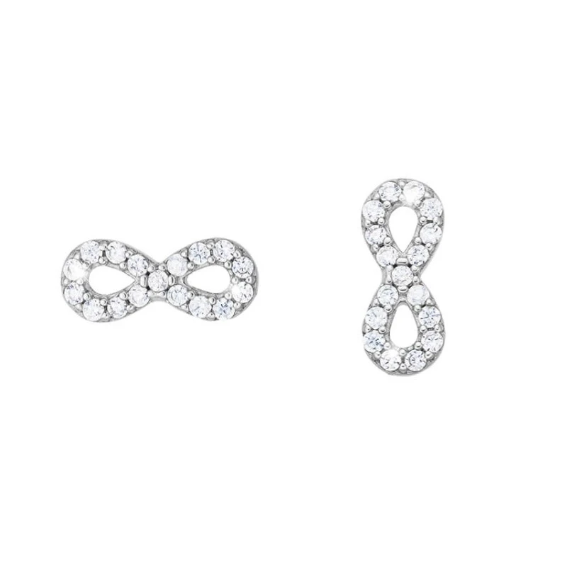 Stříbrné náušnice pecky se symbolem nekonečna ozdobené prvotřídními zirkony. Náušnice jsou vyrobené ze stříbra ryzosti 925/000. Povrch náušnic porhodiovaný. Úprava rhodiováním dodává náušnicím jasnou barvu s leskem, zvyšuje odolnost povrchu proti poškrábání a zamezuje přirozené oxidaci stříbra, náušnice budou mít po dlouhou dobu bezvadný vzhled. Rozměry symbolu nekonečna 4x10 mm. Rozměry najdete vyobrazené na podpůrné fotografii. Náušnicové zapínání je na praktický šroubek.