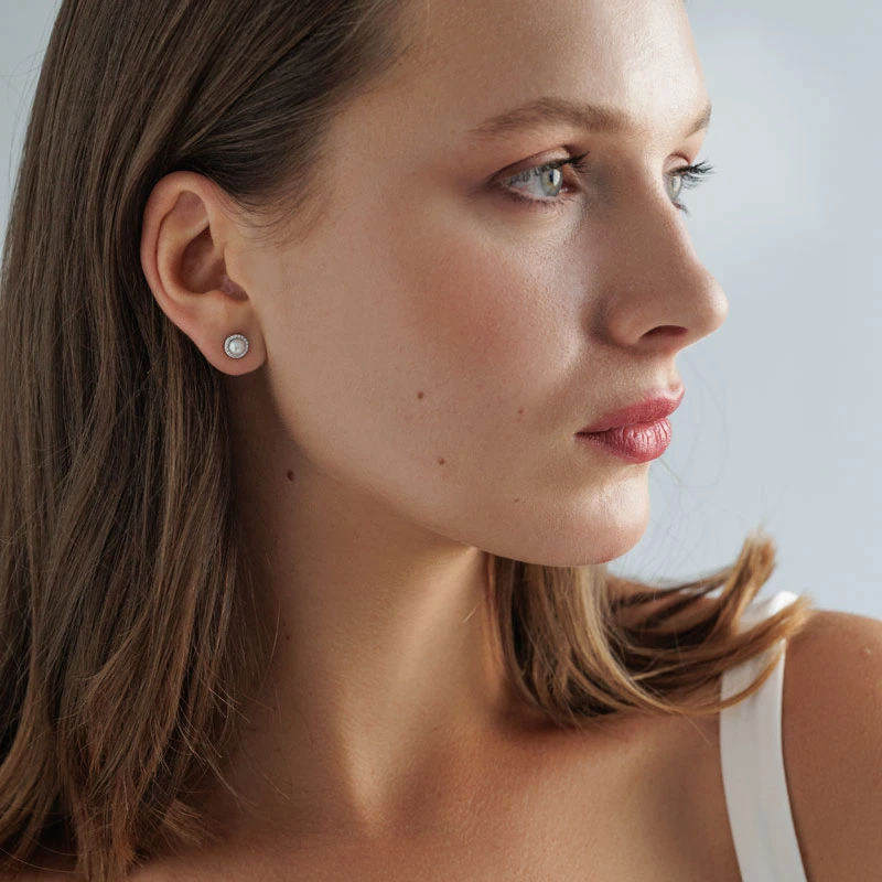 Náušnice pecky zdobené sladkovodními perlami a zářivými zirkony. Náušnice jsou vyrobené ze stříbra ryzosti 925/1000. Povrch náušnic je porhodiovaný, nanesené rhodium dodává náušnicím jasnou barvu s leskem, chrání povrch náušnic proti poškrábání a zamezuje přirozené oxidaci stříbra, náušnice tak budou mít dlouhou dobu bezvadný vzhled. Náušnicové zapínání je na puzetky. Náušnice mají průměr 7 mm, samotné sladkovodní perly mají průměr 4 mm.