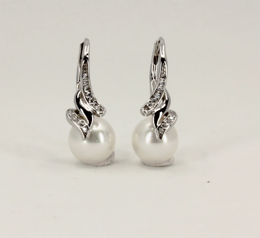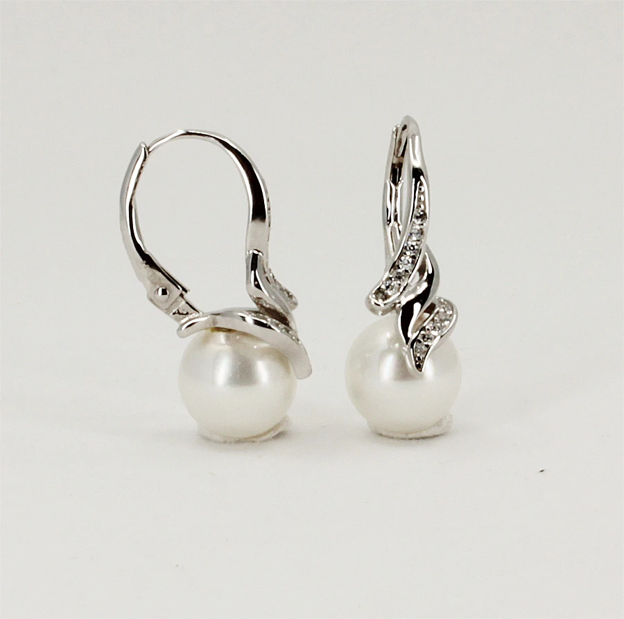 Visací stříbrné náušnice s perlami a zirkony. Náušnice jsou vyrobené ze stříbra ryzosti 925/1000 a osazené jsou přírodními perlami a prvotřídními zirkony. Povrch náušnic je porodiovaný. Nanesené rodium dodává náušnicím jasnou barvu s leskem, a současně zajišťuje dlouhodobý bezchybný vzhled náušnic. Náušnicové zapínání je na klapku. Rozměry náušnice 24x11x8mm.