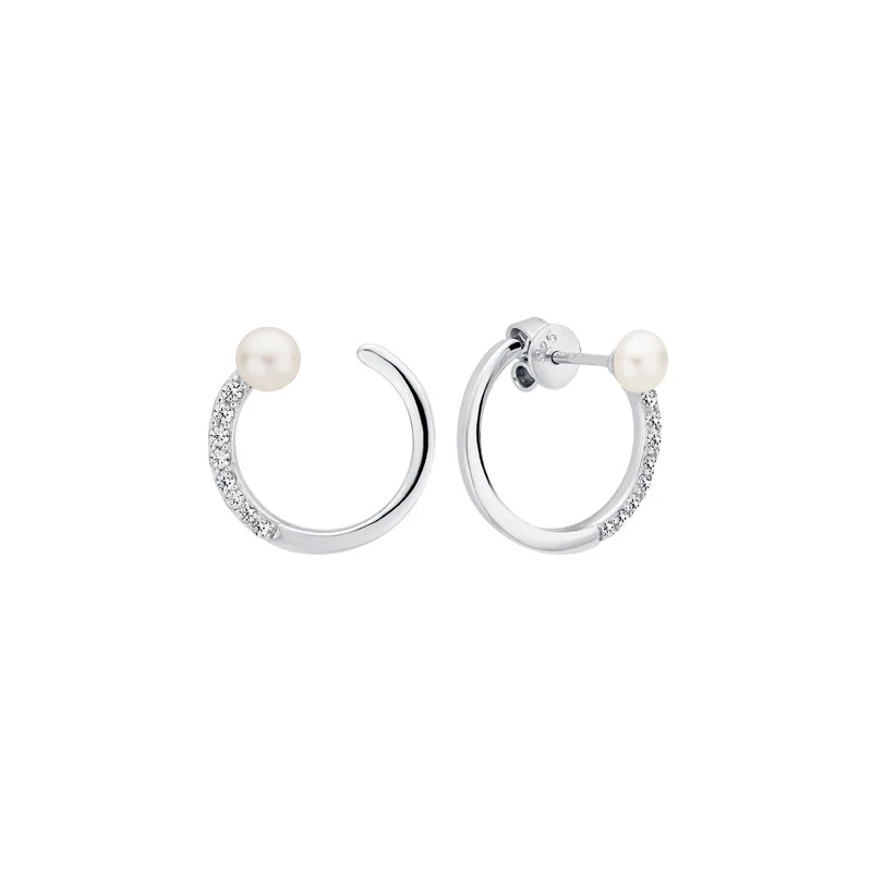 Stříbrné náušnice zdobené zirkony a říčními perlami. Náušnice jsou vyrobené ze stříbra ryzosti 925/1000. Povrch náušnic je porodiovaný. Nanesené rodium dodává náušnicím jasnou barvu s leskem, současně chrání jejich povrch před poškrábáním a zaručuje náušnicím dlouhodobý bezvadný vzhled. Náušnicové zapínání je na puzetky. Náušnice mají průměr 17 mm, průměr říčních perel 5 mm.