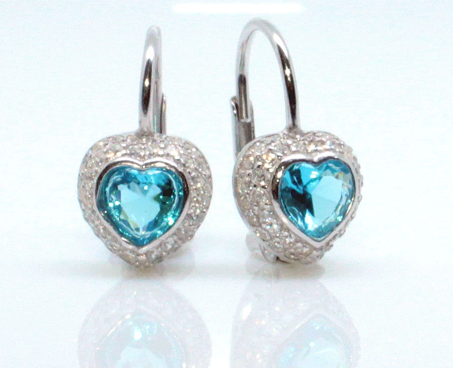 Náušnice stříbrné zdobené kamínky. Ozdobné části náušnic mají tvar srdíčka s velkým modrým kamínkem uprostřed. Povrch náušnic je porodiovaný, nanesené rodium dodává náušnicím jasnou barvu a lesk. Současně také zamezuje přirozené oxidaci stříbra. Ozdobné část náušnic tvaru srdce má rozměr 8x8 mm, celkový rozměr náušnice 11x9x8 mm.