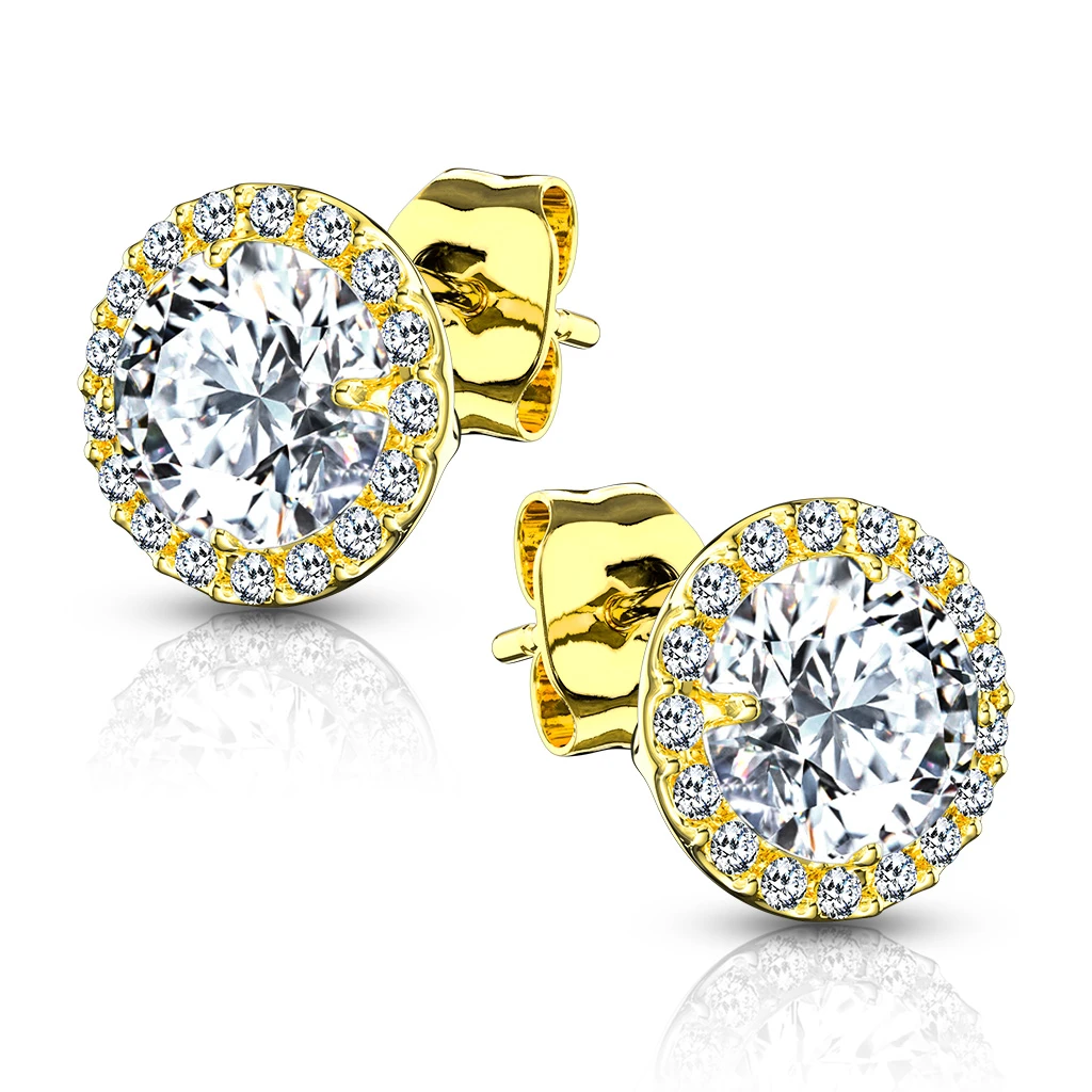 Pozlacené náušnice pecky ze stříbra 925/000 osazené zářivými zirkony. Pozlacený povrch dodává náušnicím luxusní vzhled. Náušnicové zapínání je na puzetky. Průměr náušnic 7mm.
