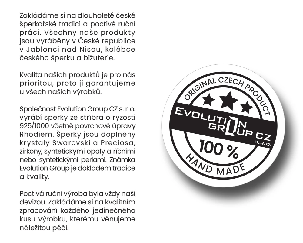 Česká společnost Evolution group navrhuje a vyrábí krásné šperky v Jablonci nad Nisou, který je považován za kolébku Českého šperku. Všechny šperky od tohoto výrobce jsou výsledkem ruční práce místních šperkařů a šperkařek. Všechny šperky z drahých kovů jsou samozřejmě označené a opuncované podle puncovního zákona.