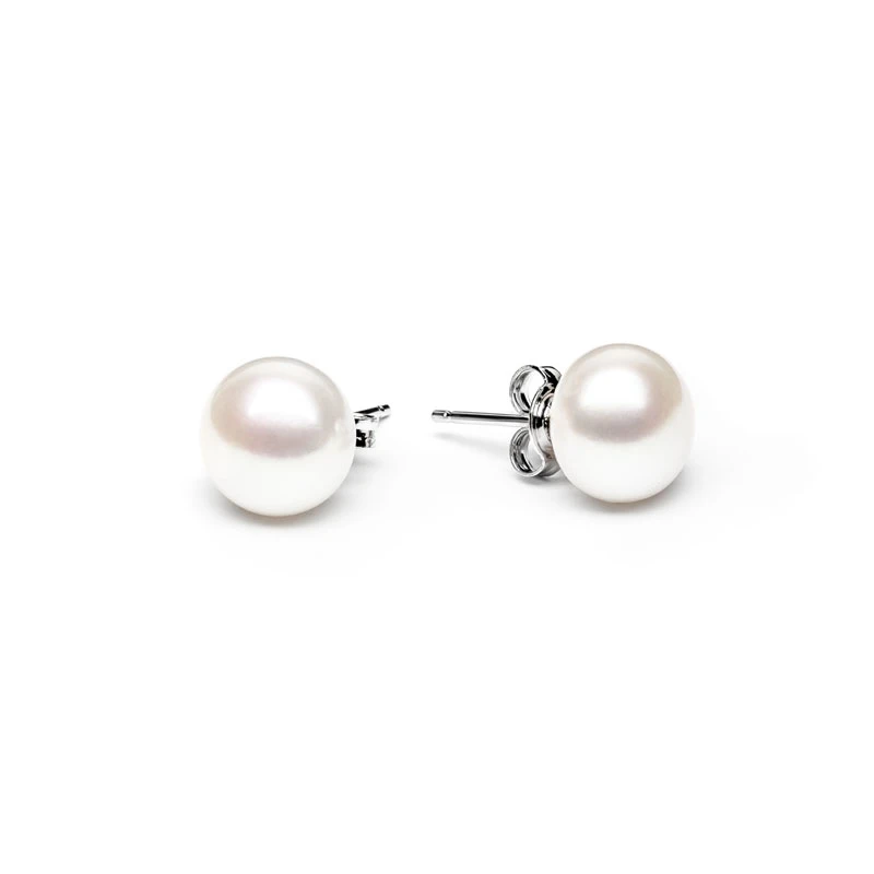 Perlové náušnice pecky ze stříbra ryzosti 925/1000, osazené říčními perlami s průměrem 10 mm. Povrch náušnic je porhodiovaný. Nanesené rhodium dodává náušnicím jasnou barvu s leskem a zajišťuje dlouhodobý bezchybný vzhled náušnic. Náušnicové zapínání je na puzetky.
