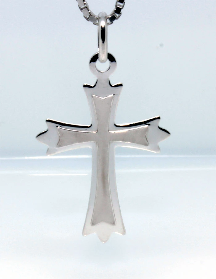Stříbrný křížek se zirkony. Křížek má porodiovaný povrch. Úprava povrchu rodiem dodává přívěsku jasnou barvu a lesk. Závěsným očkem na přívěsku je možné protáhnout stříbrný řetízek s maximálním průměrem 3,0 mm. Křížek má rozměr 23x18 mm.