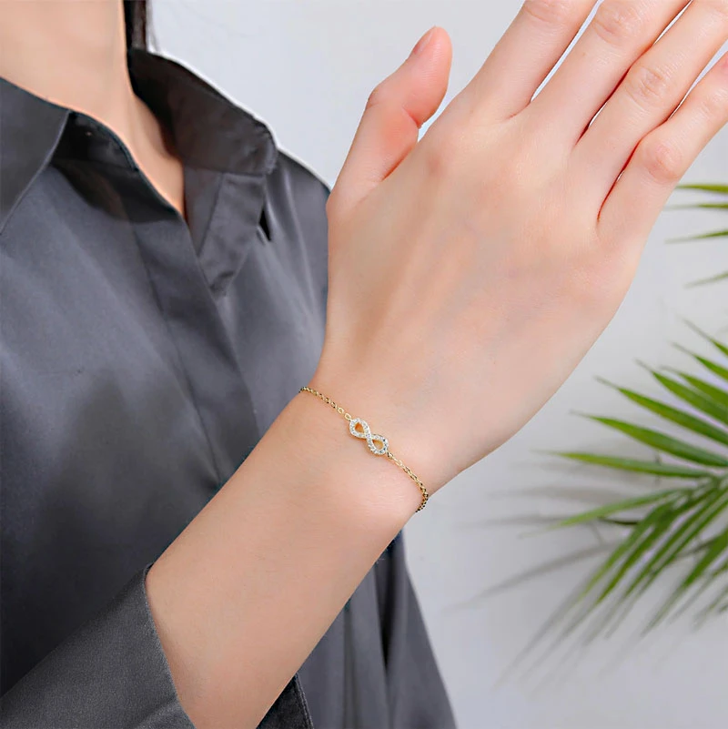 Náramek se zirkony je dokonalým doplňkem pro každou ženu. Náramek je vyrobený z kvalitního stříbra 925/1000 a je osazený oslnivými zirkony, které dodávají náramku nádech luxusu. Stříbrný pozlacený náramek se symbolem nekonečna je ideální volbou pro každou příležitost – ať už se chystáte na večerní akci, romantickou večeři nebo chcete vypadat skvěle i v běžném dni. Stříbrný náramek s kamínky může být výjimečným dárkem, který spojí krásu a styl. Neváhejte a pořiďte tento krásný stříbrný náramek pro sebe, nebo pro Vaše blízké.