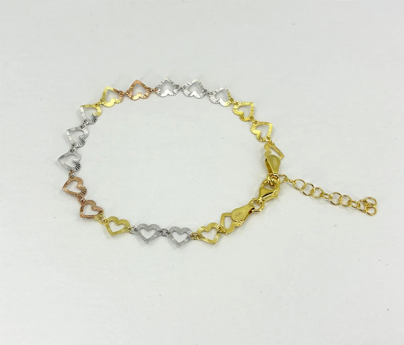 Pozlacený náramek se srdíčky ze stříbra ryzosti 925/1000. Náramek je pozlacený žlutým a růžovým zlatem, stříbrné části náramku jsou porodiované. Úprava povrchu zlacením a rodiováním dodává šperku jasnou barvu s leskem a současně zajišťuje dlouhodobý bezvadný vzhled náramku. Zapínání náramku je na karabinku. Srdíčka mají rozměr 6x6mm, délku náramku lze nastavit v rozmezí 17-20cm.