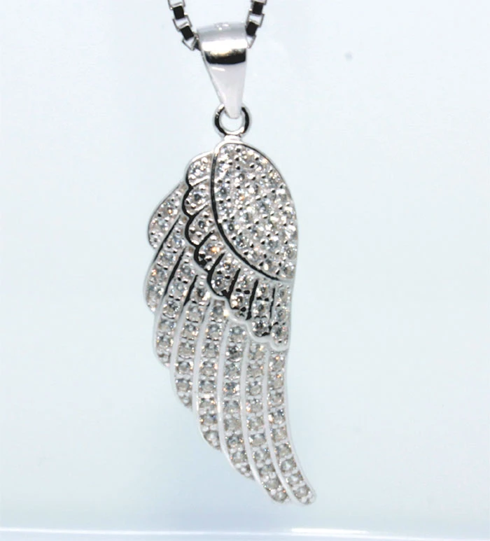 Přívěšek ze stříbra se zirkony. Přívěsek má porodiovaný povrch osazený zirkony. Rodium spolu se zirkony dodává přívěsku jasnou barvu a třpyt. Rozměr křídla 29x10 mm, očkem pro zavěšení je možné protáhnout stříbrný řetízek s průměrem do 3,0 mm.