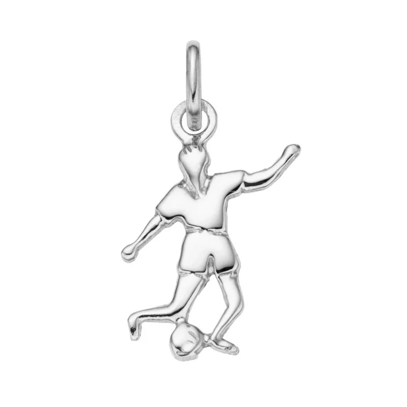 Přívěsek na řetízek fotbalista. Přívěsek je vyrobený ze stříbra 925/1000. Povrch přívěsku je porhodiovaný. Rhodium dodává přívěsku jasnou barvu s leskem a zvyšuje odolnost šperku před poškrábáním, přívěsek si tak zachová po dlouhou dobu bezvadný vzhled. Očkem na přívěsku lze protáhnout stříbrný řetízek s průměrem do 2,5mm.
