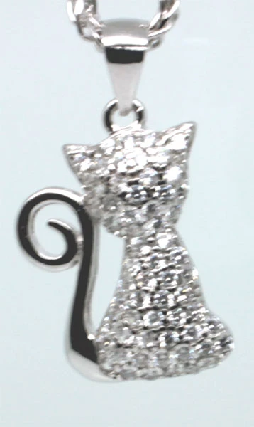 Přívěsek kočička ze stříbra 925/000. Přívěsek je osazený zirkony. Očkem pro zavěšení je možné provléct řetízek s maximálním průměrem 3,0mm. Rozměr přívěšku 17x13mm.