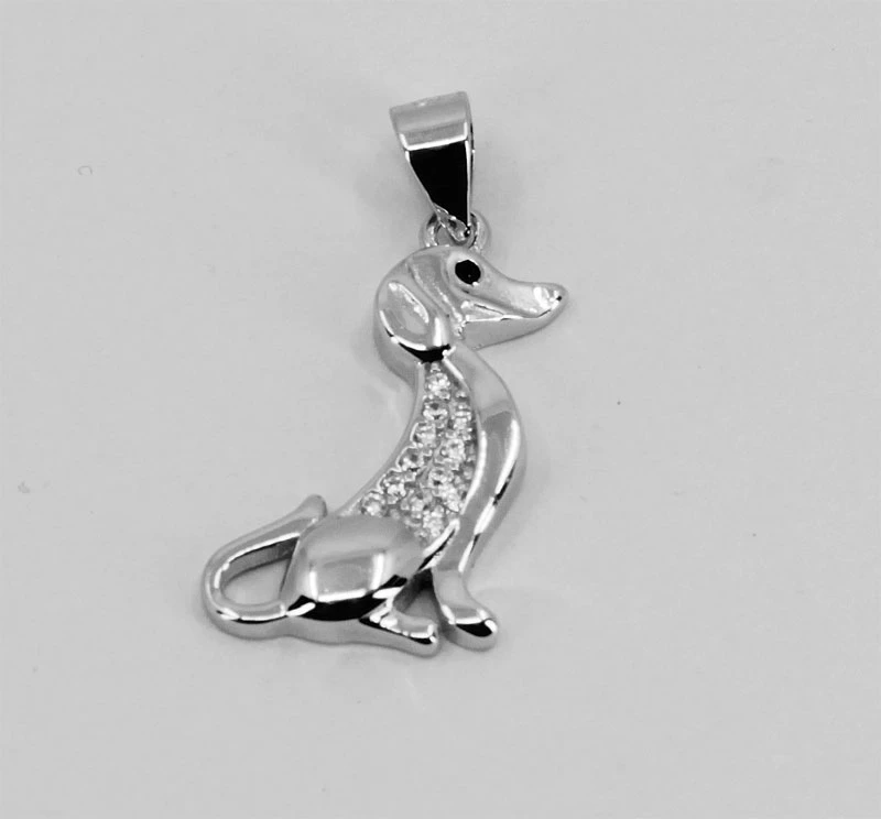 Stříbrný přívěsek na řetízek sedící pejsek ozdobený prvotřídními zirkony. Přívěšek je vyrobený ze stříbra ryzosti 925/1000. Povrch přívěsku je porhodiovaný, úprava rhodiováním zvyšuje odolnost povrchu přívěsku proti poškození a zaručuje dlouhodobý bezchybný vzhled šperku. Rozměr přívěsku 20x11mm. Závěsným očkem na přívěsku lze provléct stříbrný řetízek s průměrem do 3mm.