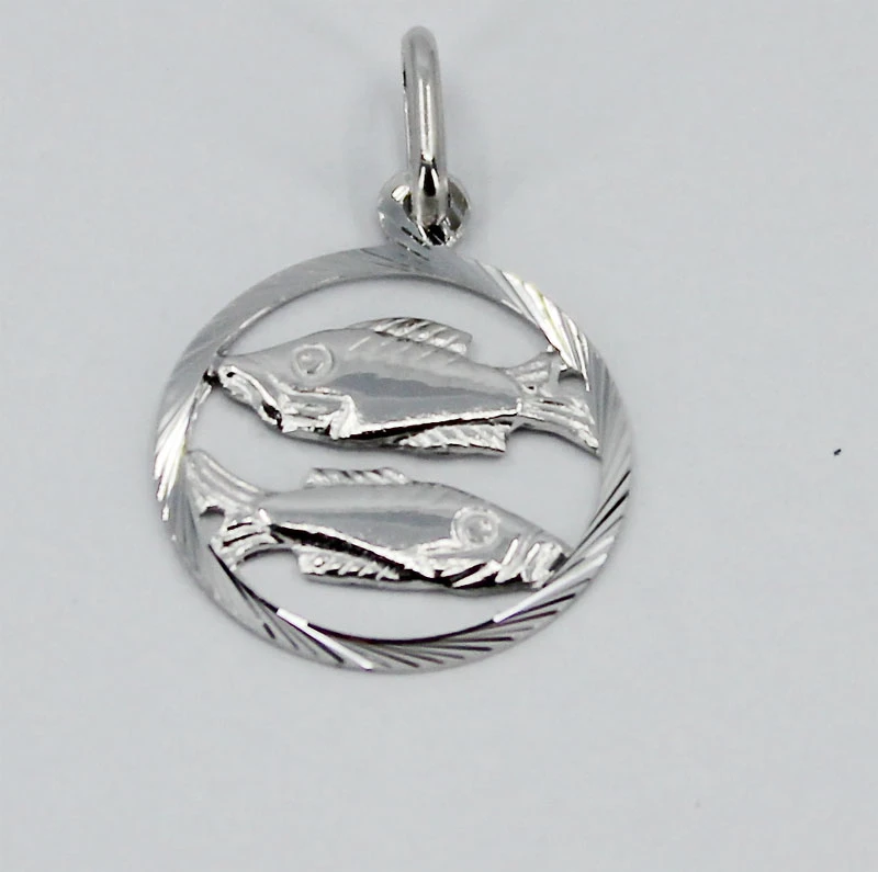 Přívěsek na krk se znamením Ryby (21.2 - 20.3). Přívěsek je vyrobený ze stříbra 925/1000. Povrch přívěsku je leštěný. Přívěšek má porhodiovaný povrch. Úprava povrchu rhodiováním dodává přívěsku jasnou barvu s leskem a současně zamezuje přirozené oxidaci stříbra. Porhodiovaný povrch přívěsku je také odolnější vůči poškrábání, šperk si tak uchová po dlouhou dobu bezchybný vzhled. Závěsným očkem na znamení lze provléct řetízek s průměrem do 3,0mm. Celková "výška" přívěsku včetně závěsného oka 22mm, průměr ozdoby s rybami 15mm.
