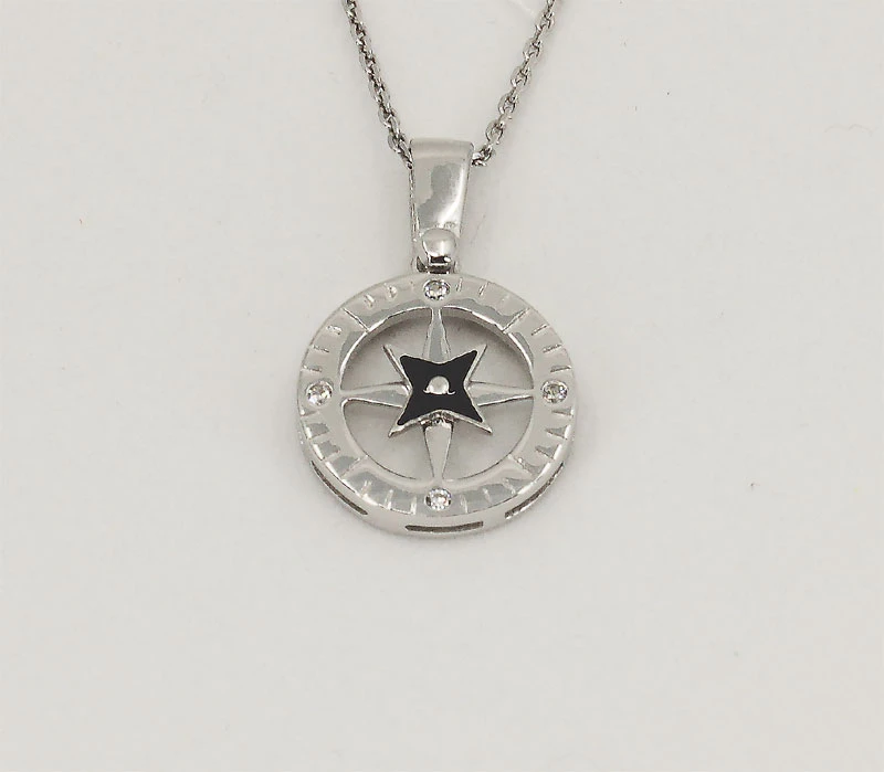 Přívěsek na řetízek "kompasová růžice" vyrobený ze stříbra 925/1000. Povrch přívěsku je porhodiovaný což mu dodává jasnou barvu s leskem a současně potlačuje přirozenou oxidaci stříbra. Úprava rhodiováním také zvyšuje odolnost povrchu proti poškrábání, přívěsek si tak dlouhodobě uchová svůj bezchybný vzhled. Kompasová růžice má průměr 16mm, závěsný očkem lze provléct stříbrný řetízek s průměrem do 2mm.