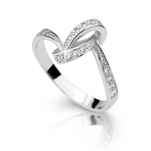 Prstýnek ze stříbra 925/000 osazený zirkony. Prstýnek má porhodiovaný povrch. Rhodium dodává prstenu zářivou barvu a lesk. Obroučka prstýnku je široká 2,7 mm. ozdoba se zirkonem má rozměr 4x11 mm.
