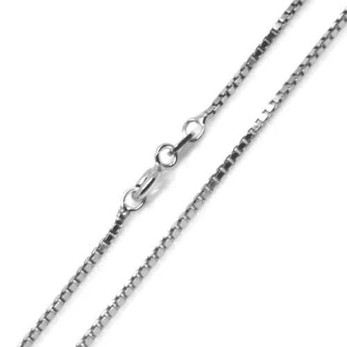 Stříbrný řetízek vzor kostka. Řetízek má porhodiovaný povrch. Úprava rhodiováním zamezuje přirozené oxidaci stříbra, potlačuje alergické reakce a současně dodává řetízku jasnou barvu a lesk. Řetízek má čtvercový průřez se stranou 1,1mm. Zapínání řetízku je karabinové.