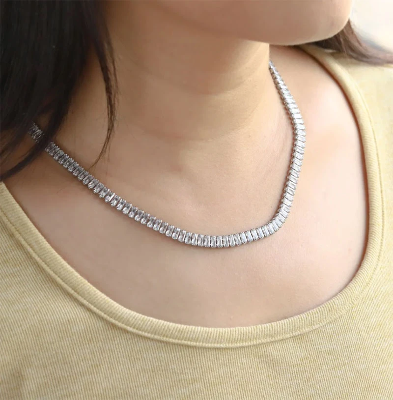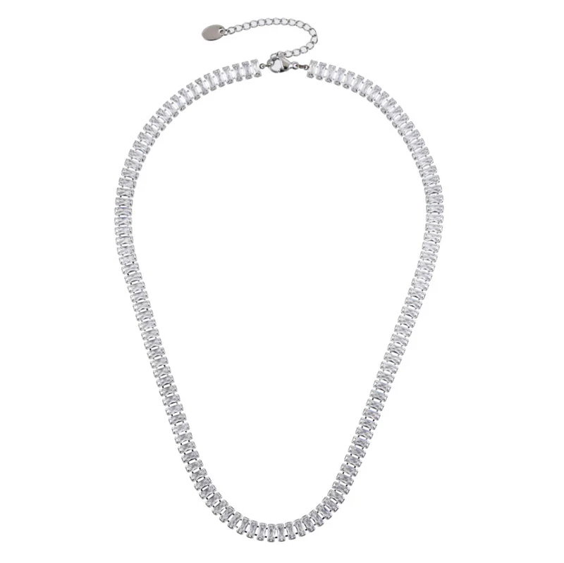 Tenisový náhrdelník z chirurgické oceli osazený zářivými zirkony. Povrch náhrdelníku je leštěný. Zapínání náhrdelníku je karabinové. Délku náhrdelníku lze nastavit v rozmezí 40-45 cm. Náhrdelník je široký 6 mm. Díky použité kvalitní chirurgické oceli je náhrdelník hypoalergenní, neoxiduje ani nemění barvu. Tento tenisový náhrdelník tak mohou bez obav nosit i osoby s citlivou pokožkou.