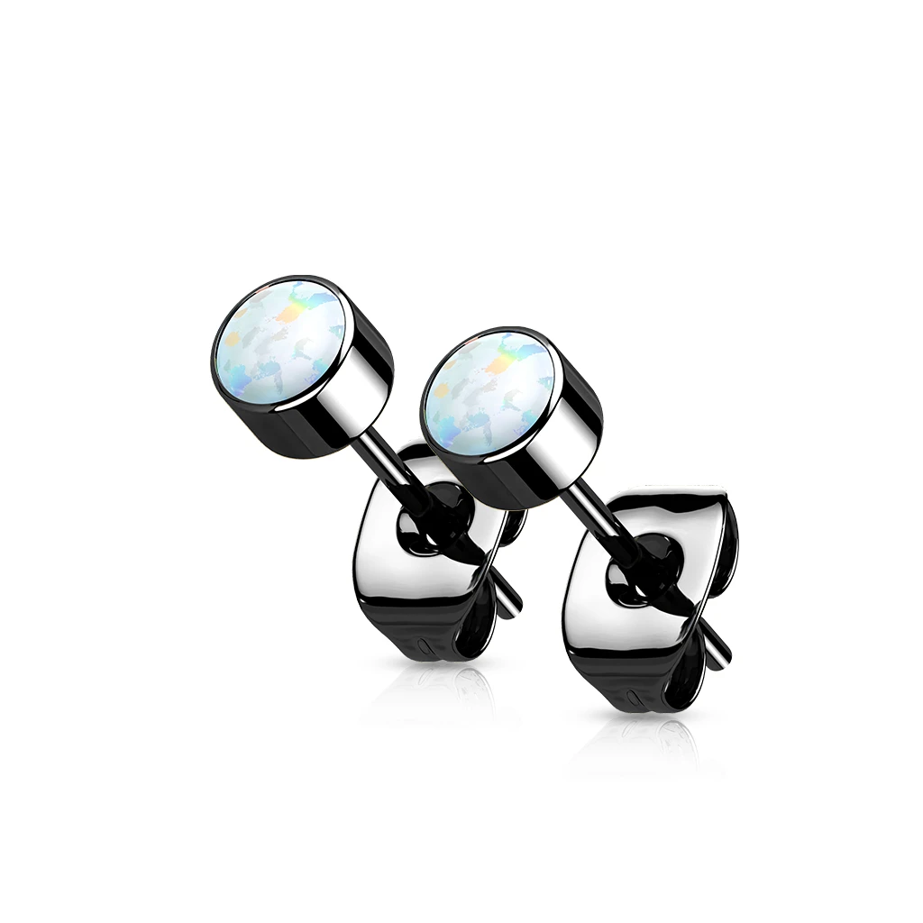 Titanové náušnice pecky ozdobené umělým opálem. Náušnice mají průměr 3mm. Náušnicové zapínání je na puzetky. Dřík náušnic má průměr 0,7 mm, délka dříku 10 mm. Uvedená cena platí za pár.