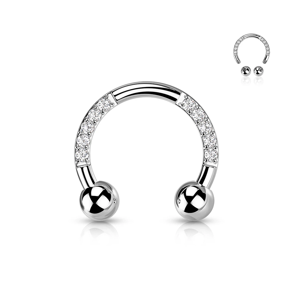 Piercing do ucha podkova se zirkony. Piercing je vyrobený z titanu s označením 6AL-4V-ELI ASTM F-136. Kuličky mají průměr 3mm. Rozměry piercingu jsou zobrazené na podpůrné fotografii.
