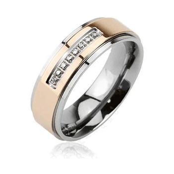 Prsten z titanu. Prsten má leštěný povrch. Prsten má IP barvu růžového zlata. Prstem zdobí zirkony. Prsten je široký 8mm. Pěkný dámský titanový prsten se zirkony.