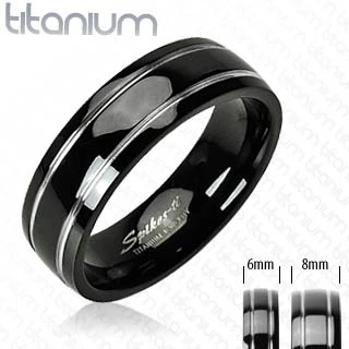 Prsten z titanu. Prsten má černou barvu se dvěma leštěnými proužky. Ve velikostech 49, 51,55,57 je prsten široký 6mm, ve velikostech 59,63,65,67,69,73 je prsten široký 8mm. Tento prsten lze použít jako snubní.