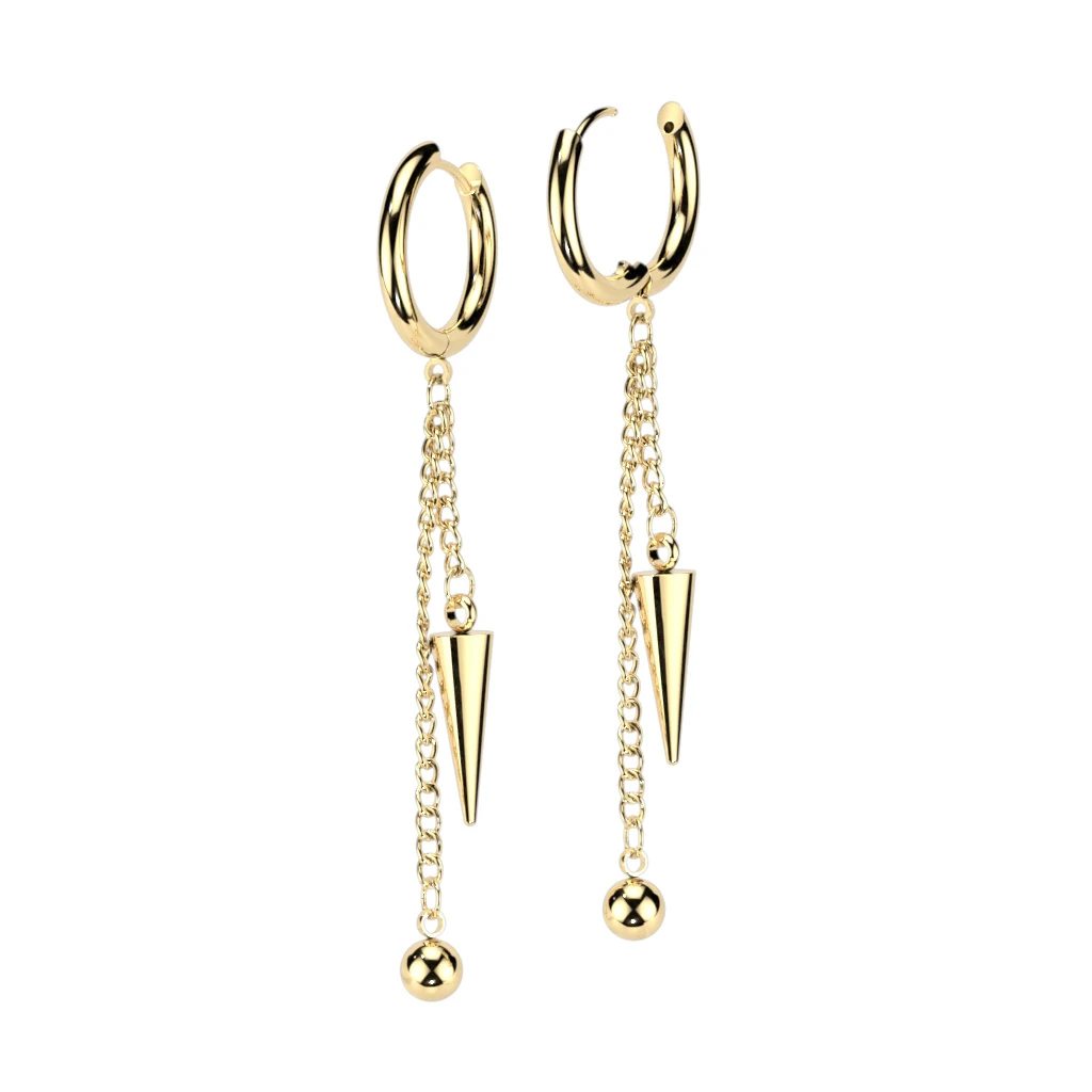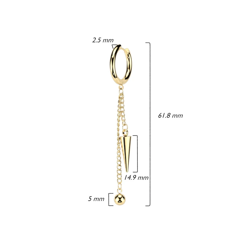 Náušnice z chirurgické oceli tvořené kruhy s vnějším průměrem 16 mm, a dvěma přívěsky na řetízku. Ocelové náušnice dlouhé 61,8 mm. Celkové rozměry náušnic najdete zobrazené na podpůrné fotografii. Povrch náušnic je leštěný.