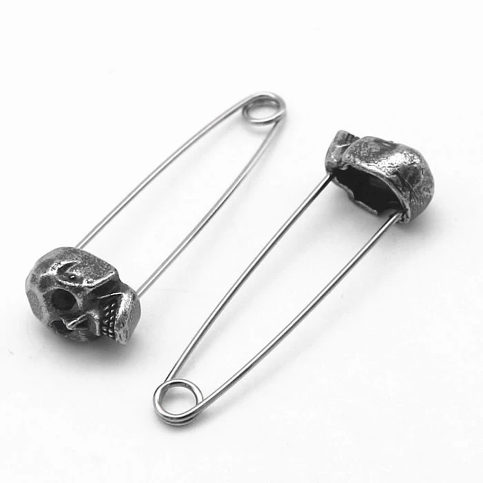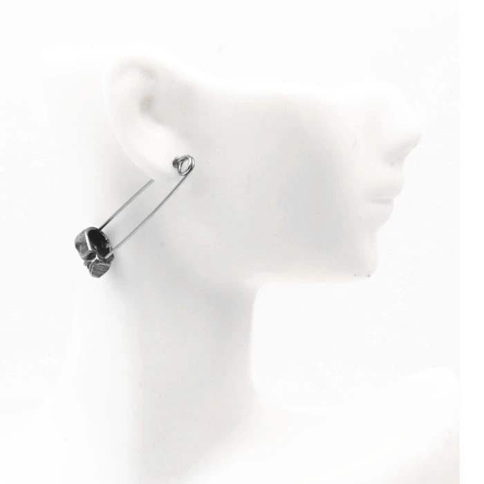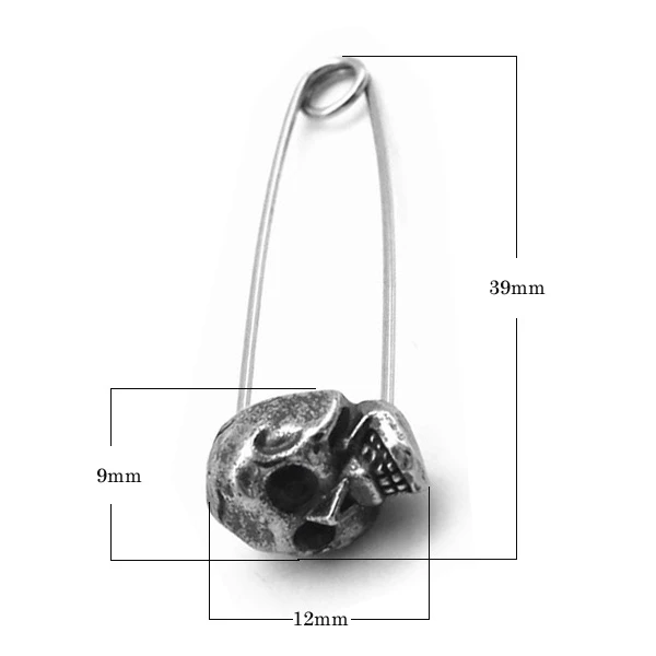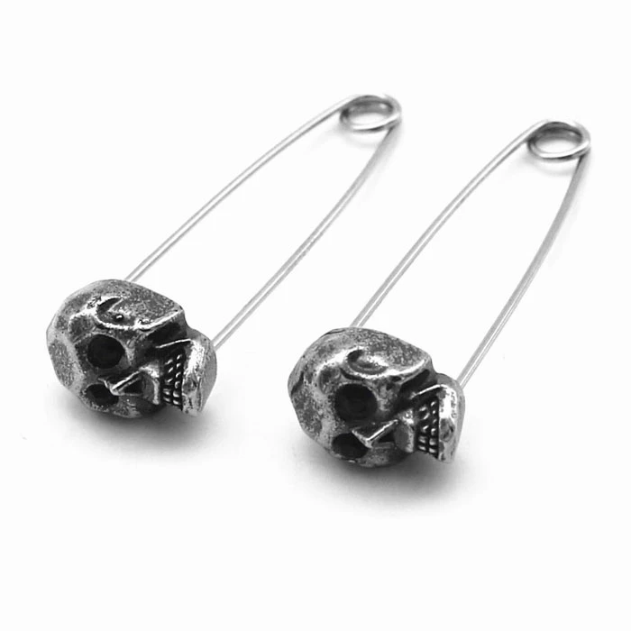 Ocelové visací náušnice s lebkami. Náušnice představuje spínací špendlík s lebkou. Rozměry náušnic najdete vyobrazené na podpůrné fotografii. Uvedená cena platí za pár náušnic.