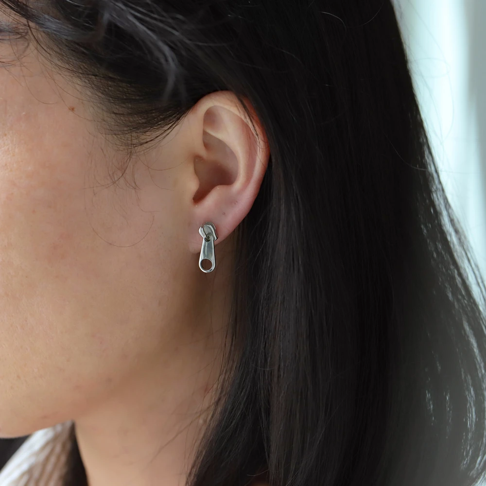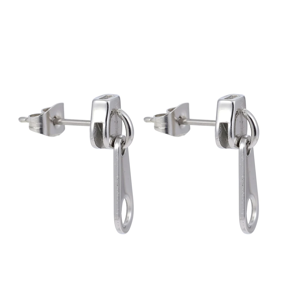 Ocelové visací náušnice napodobující jezdce na zipu. Povrch náušnic je leštěný. Délka náušnice 17mm, šířka 6mm. Náušnicové zapínání je na puzetky.