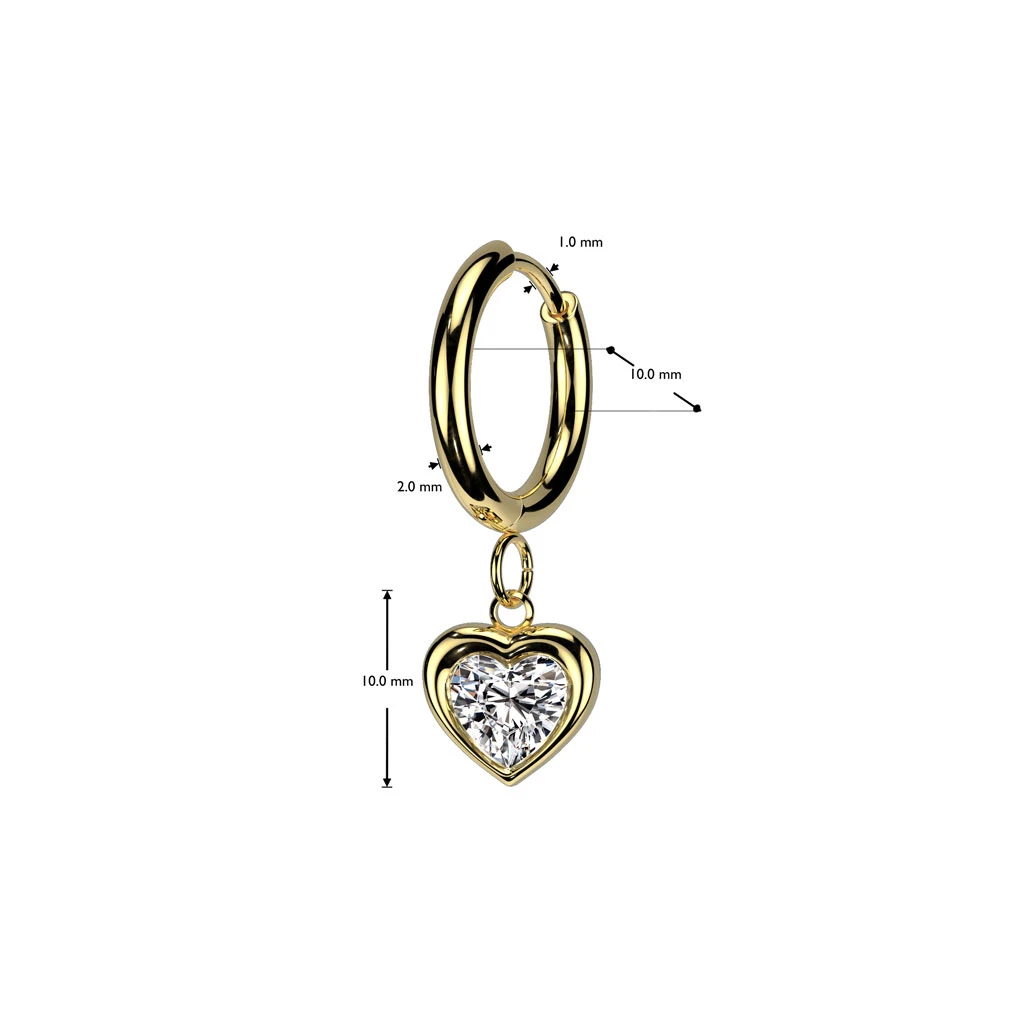 Kruhové náušnice z chirurgické oceli s přívěskem srdíčka. Náušnice mají leštěný povrch. Vnitřní průměr kroužku 10mm, vnější průměr 14mm. Rozměr srdíčka se zirkonem 8x9mm. Celková délka náušnice 27mm. Náušnicové zapínání je kloubové. Uvedená cena platí za pár náušnic.