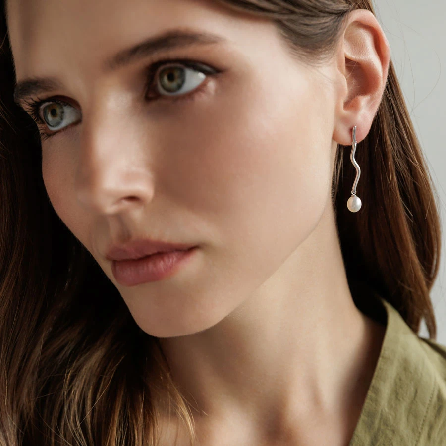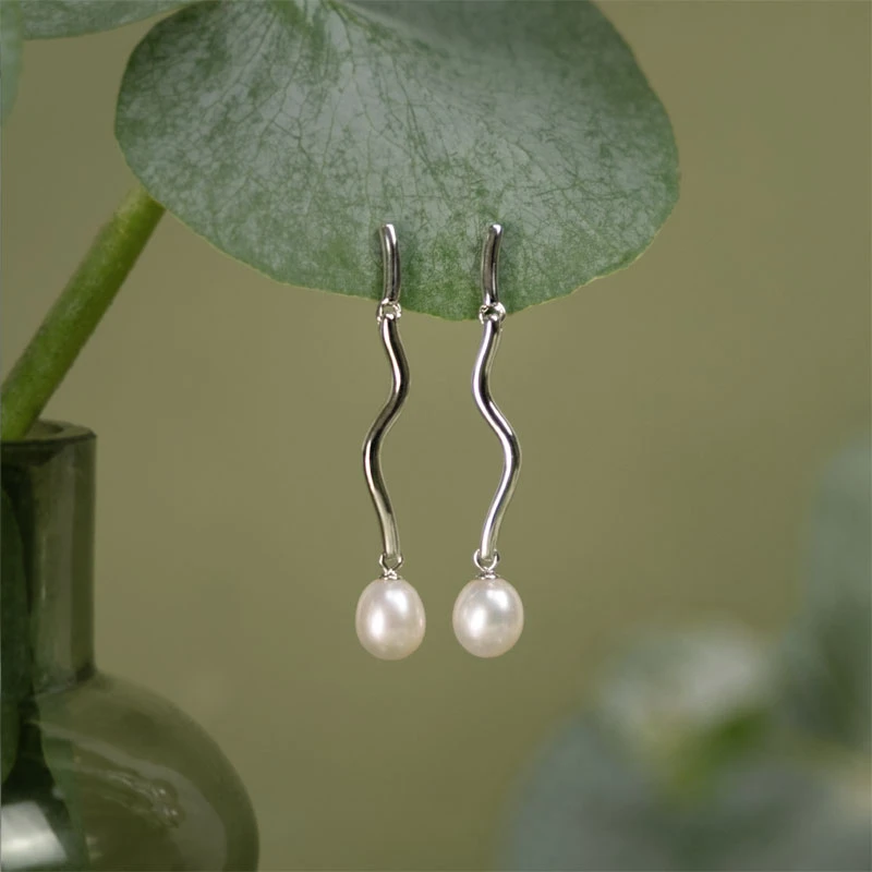 Stříbrné náušnice visací zdobené sladkovodními perlami. Náušnice jsou vyrobené ze stříbra ryzosti 925/1000. Povrch náušnic je porhodiovaný. Úprava náušnic rhodiováním dodává náušnicím jasnou barvu s leskem, chrání povrch náušnic před poškrábáním a potlačuje přirozenou oxidaci stříbra. Náušnice jsou dlouhé 42 mm, náušnicové zapínání je na puzetky.