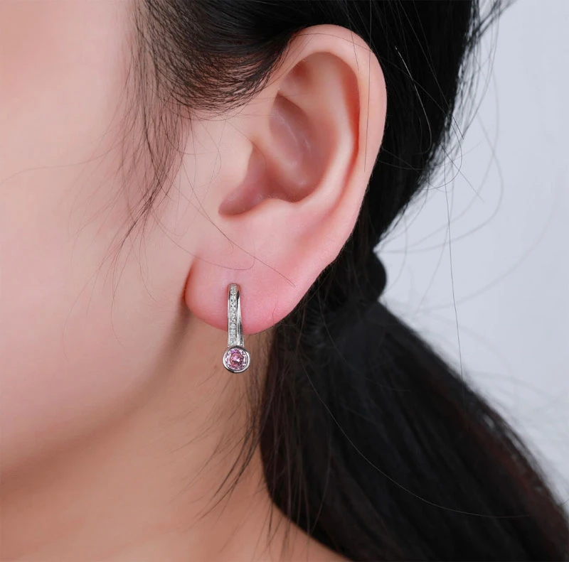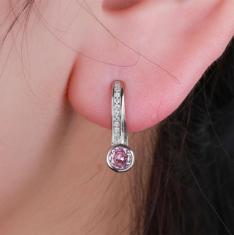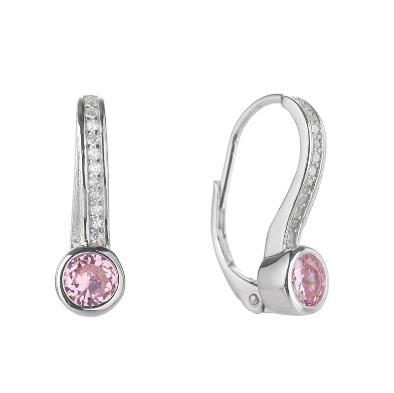 Visací náušnice ze stříbra ryzosti 925/1000 ozdobené růžovými a bílými zirkony. Povrch náušnic je porhodiovaný, úprava povrchu rhodiováním dodává náušnicím jasnou barvu s leskem, chrání povrch náušnic proti poškrábání a potlačuje přirozenou oxidaci stříbra, náušnice tak budou dlouhou dobu bezvadný vzhled. Náušnice jsou dlouhé 19 mm, ozdoba s růžovým zirkonem má průměr 6 mm. Náušnicové zapínání je na klapku.