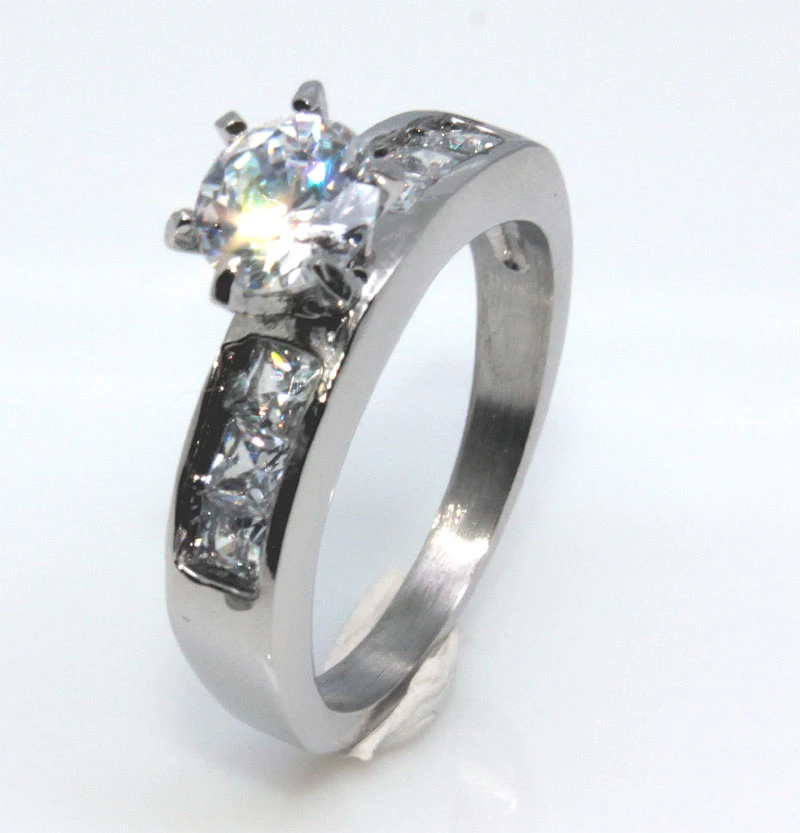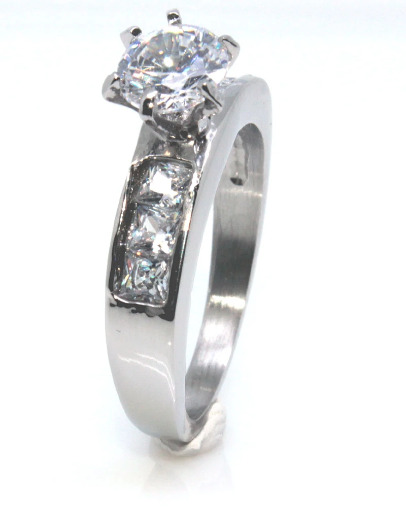 Zásnubní prsten z chirurgické oceli ozdobený zirkony. Povrch prstenu je leštěný. Průměr velkého zirkonu 6 mm. Obroučka prstenu je v nejširším místě široká 5 mm, postupně se zužuje na 3 mm.