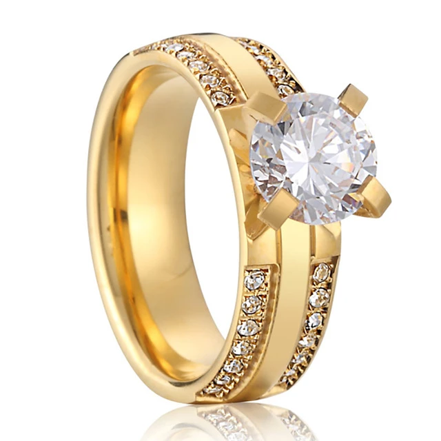 Zásnubní prsten z chirurgické oceli se zirkony. Obroučky prstýnku je široká 6 mm, povrch je leštěný pozlacený technologií IP. Průměr velkého zirkonu 6 mm. Kamínky jsou fasované a nehrozí jejich vypadnutí.