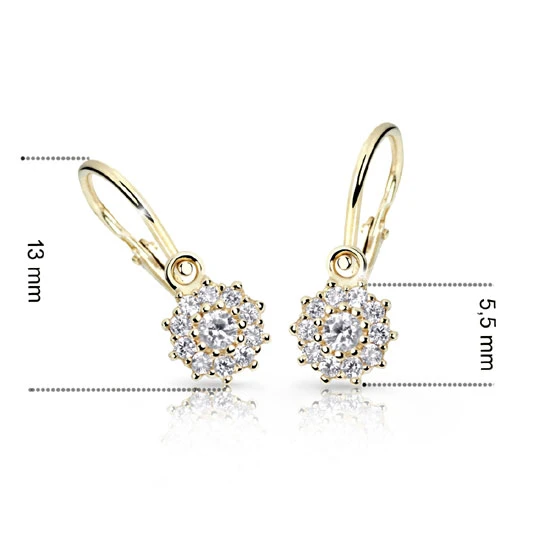 Dětské zlaté náušnice ze žlutého zlata 585/000. Náušničky pro děti ozdobené třpytivými kamínky. Náušnice pro miminko se zapínáním na bezpečností dětskou brizuru. Průměr ozdobné části s kamínky 5,5 mm, celková výška náušniček 13 mm. Celkové rozměry náušniček najdete na podpůrném obrázku.