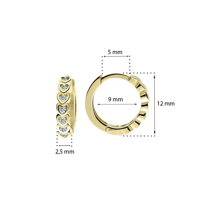 Dětské náušnice kroužky ze žlutého zlata ryzosti 585/1000. Kruhový tvar dětských náušniček je velmi praktický a zaručuje pohodlného užívání dětských náušniček jak pro miminka, tak pro větší parádnice školou povinné. Vnější průměr náušniček 12mm, vnitřní průměr 9mm. Kroužky jsou široké 2,5mm. Dřík zapínání je dlouhý 5mm. Rozměry těchto zlatých dětských náušnic najdete na přehledném podpůrném obrázku.