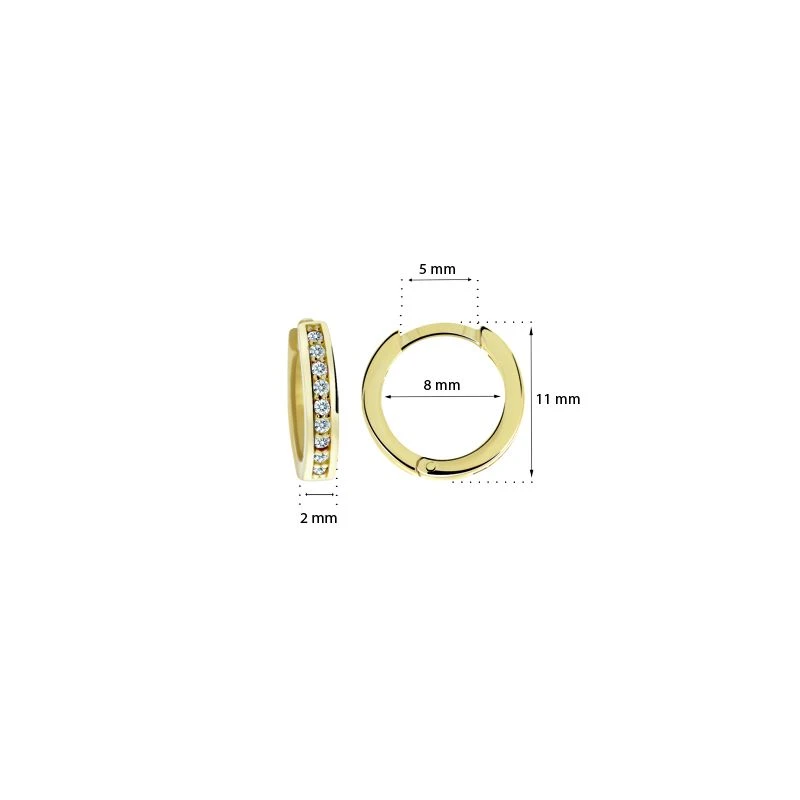 Dětské náušnice kroužky ze žlutého zlata 585/000. Praktický kruhový tvar dětských náušniček je zárukou jejich pohodlného nošení. Vnější průměr náušniček 11 mm, vnitřní průměr 8 mm. Kroužky jsou široké 2,0 mm. Dřík zapínání je dlouhý 5 mm. Rozměry kroužků najdete zobrazené na podpůrné fotografii.