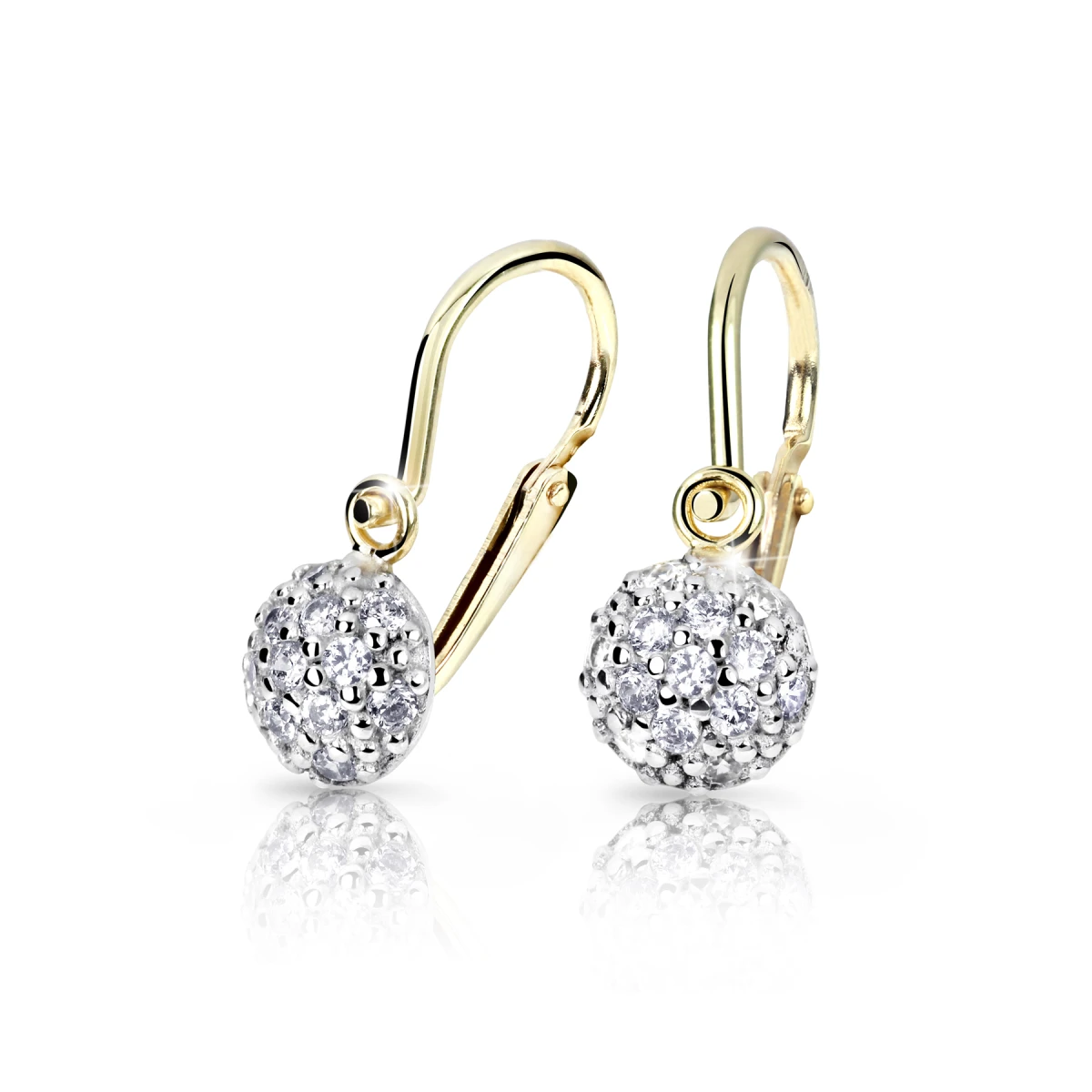 Dětské zlaté náušnice ze žlutého zlata 585/000. Náušničky pro děti ozdobené třpytivými zirkony. Náušnice pro miminko se zapínáním na bezpečností dětskou brizuru. Průměr ozdobné části s kamínky 6,5 mm, celková výška náušniček 14 mm.