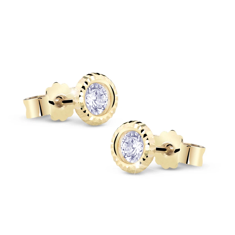 Náušnice pecky ze žlutého zlata se zirkony. Náušnice jsou vyrobené ze zlata 585/1000. Ozdoba se zirkonem má průměr 5mm, samotný zirkon má průměr 3mm. Náušnicové zapínání je na puzetky.
