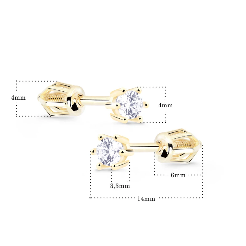 Zlaté náušnice se zirkony vyrobené z bílého zlata ryzosti 585/1000. Klasické náušnice pecky ozdobené 4mm zirkonem. Praktické náušnicové zapínání na šroubek zaručuje pohodlné užívání náušnic. Rozměry náušnic najdete zobrazené na podpůrné fotografii.