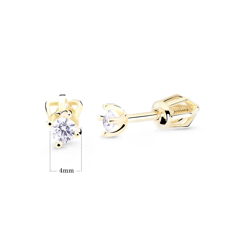 Náušnice ze žlutého zlata ryzosti 585/000. Jednoduché zlaté pecky se zirkony se zapínáním na šroubek. Průměr ozdoby se zirkonem 4mm.