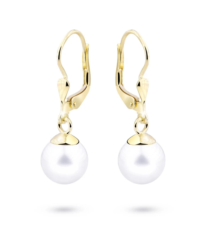 Zlaté visací náušnice s říční perlou ze žlutého zlata ryzosti 585/1000. Použité kultivované říční perly jsou v kvalitě AAA. Průměr perel 6mm. Náušnicové zapínání je na klapku.