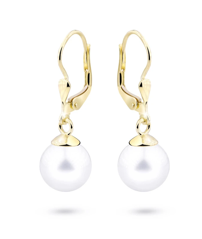Zlaté visací náušnice s říční perlou ze žlutého zlata ryzosti 585/1000. Použité kultivované říční perly jsou v kvalitě AAA. Průměr perel 9mm. Náušnicové zapínání je na klapku.
