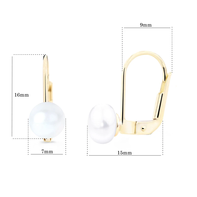 Náušnice ze žlutého zlata ryzosti 585/1000. Použité říční perly jsou kvality AAA. Perly této nejvyšší kvality mají lesklý povrch bez jakýchkoliv vad a mají dokonale kulatý tvar. Náušnicové zapínání je na klapku. Rozměry náušnic 15x16mm a průměr použitých perel 7mm najdete zobrazené na podpůrné fotografii.