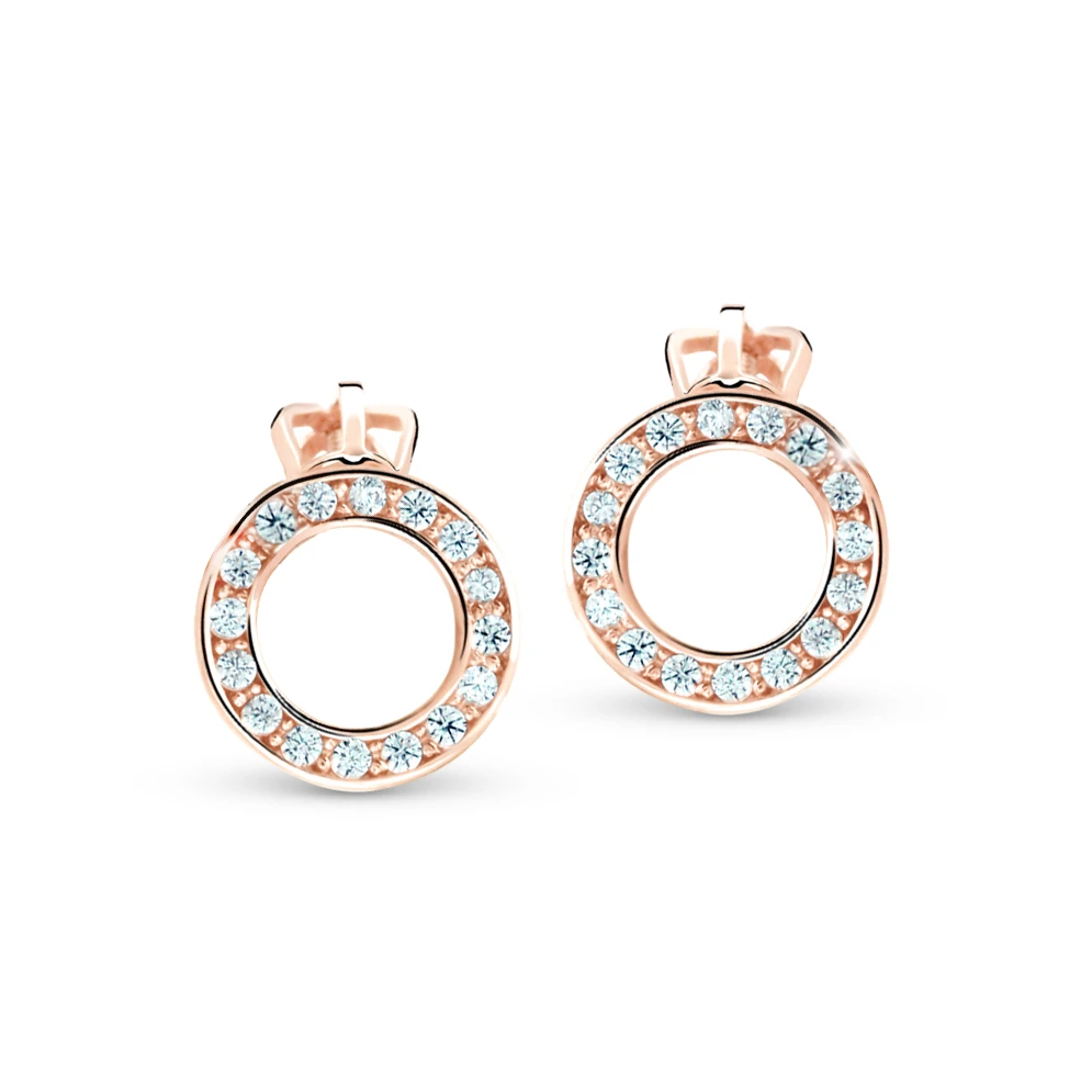 Náušnice na šroubek vyrobené z růžového zlata 585/1000. Náušnice jsou ozdobené prvotřídními zirkony. Náušnicové zapínání je na praktický šroubek. Vnější průměr náušnic 8 mm. Rozměry náušnic najdete vyobrazené na podpůrné fotografii.