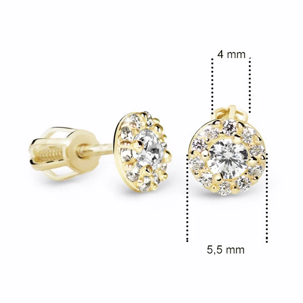 Zlaté náušnice se zirkony vyrobené zlata ryzosti 585/000. Náušnice zlaté s průměrem ozdoby 5,5 mm. Naušnicové zapínání na je na šroubek. Průměr šroubovacího zapínání 4 mm.