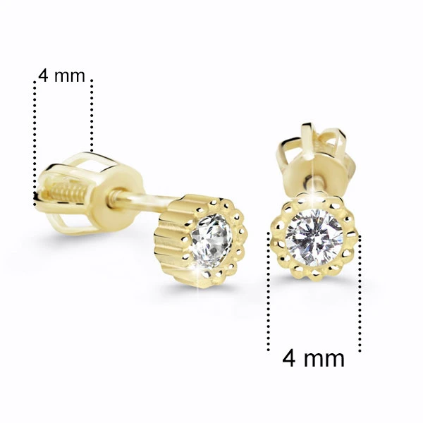 Zlaté náušnice pecky se zirkony vyrobené zlata ryzosti 585/000. Zlaté naušnice s průměrem ozdoby 4mm. Naušnicové zapínání na je na šroubek. Průměr šroubovacího zapínání 4 mm.