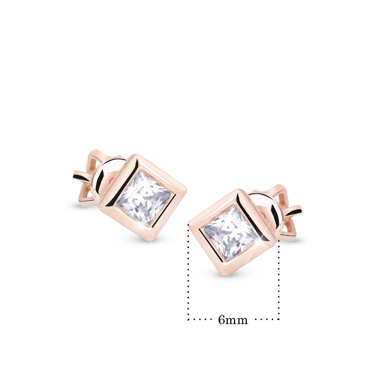 Náušnice na šroubek se zirkony vyrobené z růžového zlata ryzosti 585/1000. Hranaté zlaté náušnice pecky osazené zirkony. Praktické náušnicové zapínání na šroubek zaručuje pohodlné užívání náušnic. Rozměry náušnic najdete zobrazené na podpůrné fotografii.