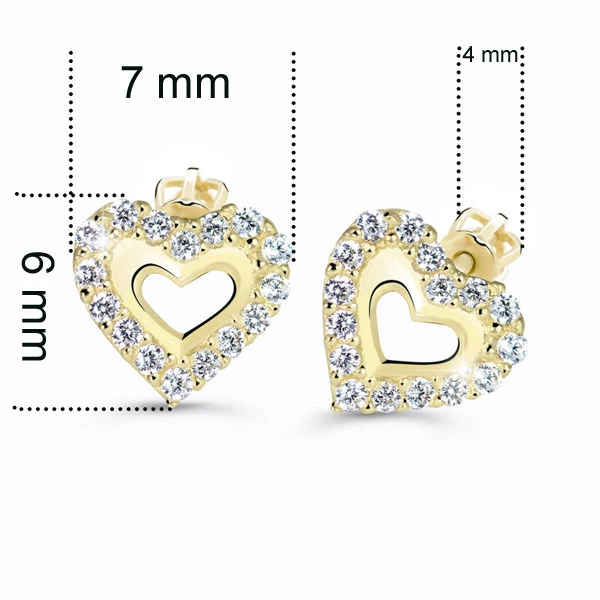 Zlaté náušnice se zirkony vyrobené ze zlata ryzosti 585/000. Zlaté náušnice s ozdobou srdíček velikosti 6x7 mm. Naušnicové zapínání na je na šroubek. Průměr šroubovacího zapínání 4 mm.